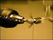 Match two biots together so the points flair outward. Place them on the side of the dubbed body, pointing rearward. Tie in at the bead to secure the biots in the proper position.